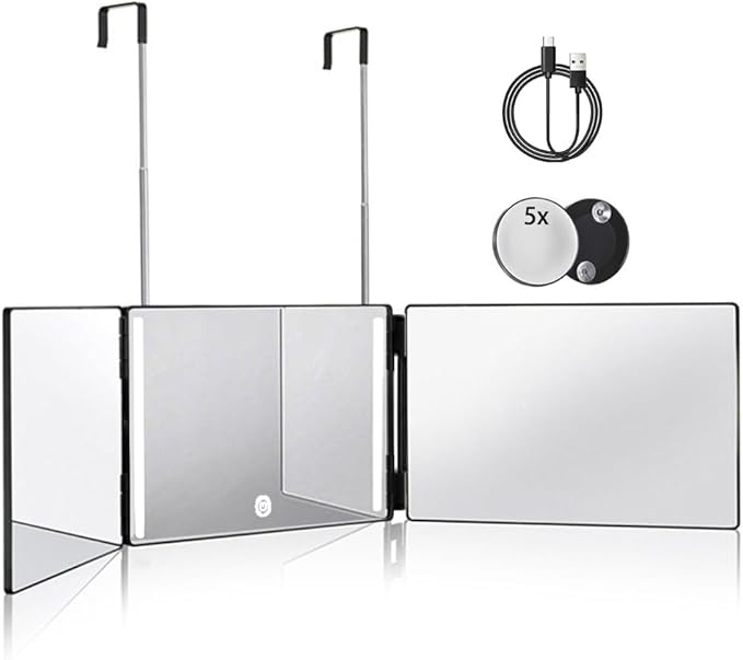 HIEEY 3 Way Mirror for Hair Cutting with LED,360 Trifold with Height Adjustable Telescoping Hooks,and 5X Magnification,for Makeup and Styling (Black)