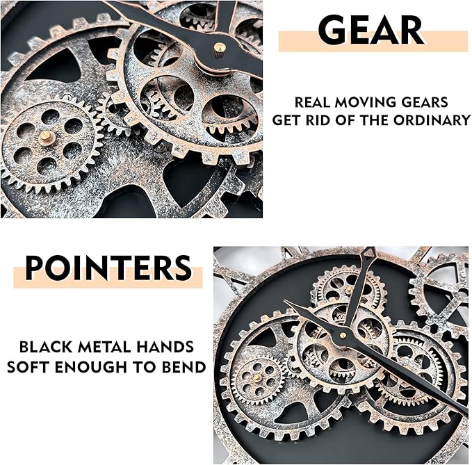 - REAL MOVING GEARS: Large wall clock with unique moving parts is as attractive as it is functional. Put batteries in, various gears start rotating fluently. Moving gear wall clock is amazing looking on the wall and will get so many compliments on it. Made from solid wood and painted by Rust-like color on wall clock create a very rustic and industrial atmosphere. Farmhouse wall clock is professionally handmade and pursuit of naturalness, so it may have some little imperfections.