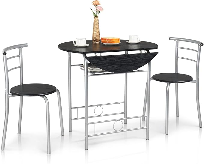 VINGLI 31.5" Drop Leaf Dining Table Set 3 Pieces for Small Space,Small Kitchen Table Set for 2,Round Folding Dining Table with 2 Chairs for Home,Kitchen,Apartment,Silver&Black