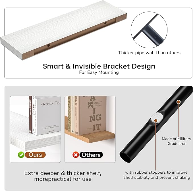 - Extra Deeper & Thicker - This wall shelf measures 36"W x 10.23"D x 1.8"H. Extra deeper and thicker design in order to bring maximizes storage space and weight capacity, even hold up to 70 lb. This floating shelf taking up zero square feet, reduces clutter and highlights dรฉcor in compact spaces.
