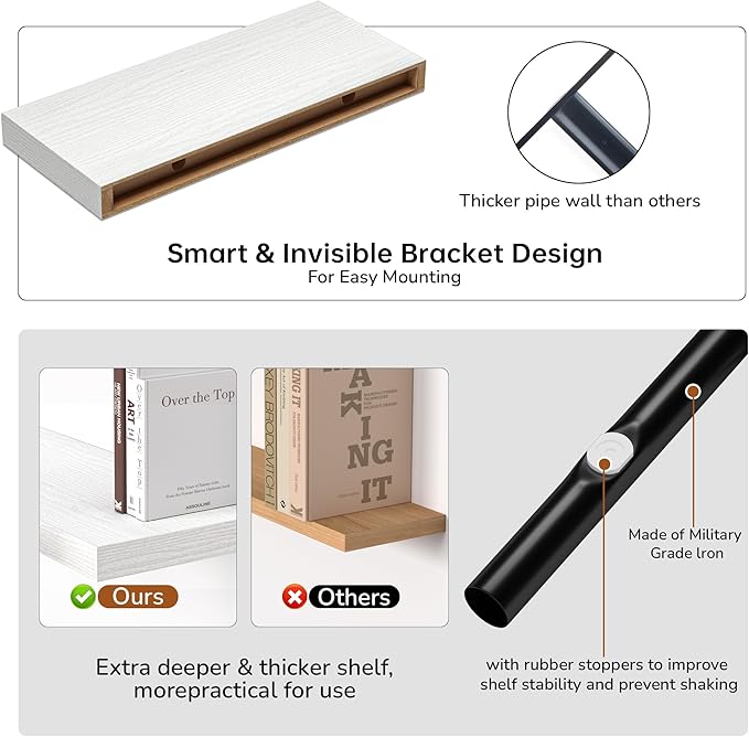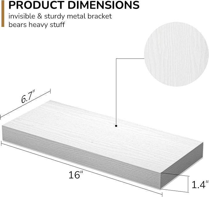 - Extra Deeper & Thicker - Each board measures 16"W x 6.7"D x 1.4"H. Extra deeper and thicker design in order to bring maximizes storage space and weight capacity, even hold up to 30 lb each. This floating shelf taking up zero square feet, reduces clutter and highlights dรฉcor in compact spaces.