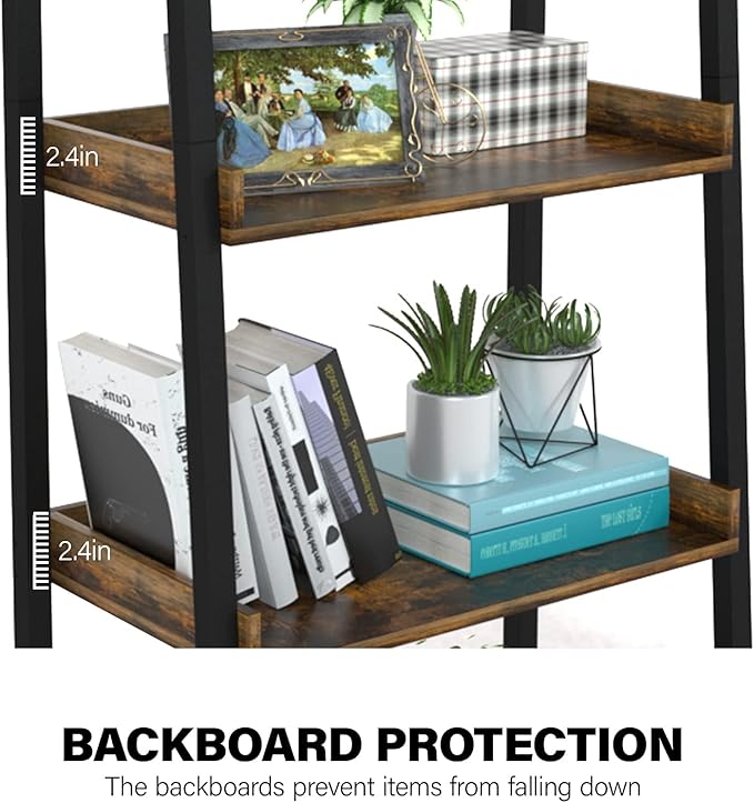 - Simple Industrial Style: Our 5-Tier ladder shelf bookcase features clean lines which combine premium rustic brown wood panel & metal frame, making this freestanding display shelf an elegant feeling for any bedroom, living room, kitchen, study, balcony, or entry furniture decor. Dimension: 23.6(L)*13.7(W)*67.3(H)
