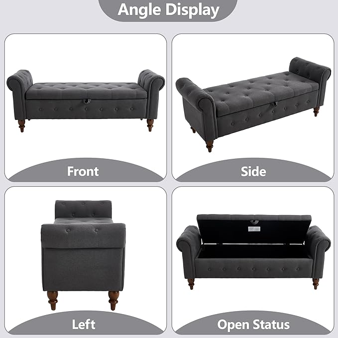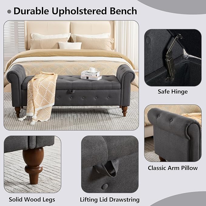 - End of Bed Storage Bench: The fabric upholstered indoor storage bench has a very refined vintage look, it features elegantly rolled arms for a luxurious look. Easy to move around and versatile, this ottoman couch chair is used for storage or bench, keeping pillows or clothes.
