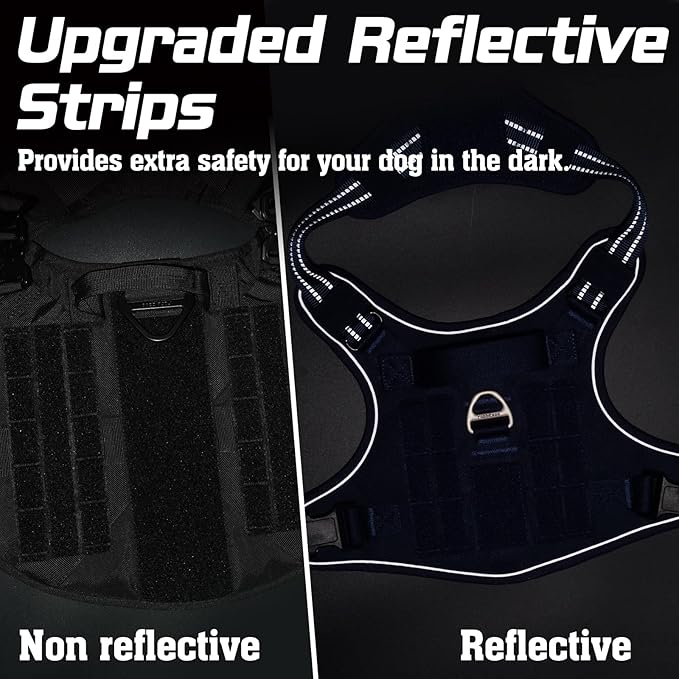 - Ultra Safety Design: The reflective trims all around the tactical dog harness for optimal visibility and security at night. Two secure metal leash attachments for different occasions. Daily back clip for well-trained dog's casual walking or jogging. No-pull front clip helps discourage your dog from pulling
