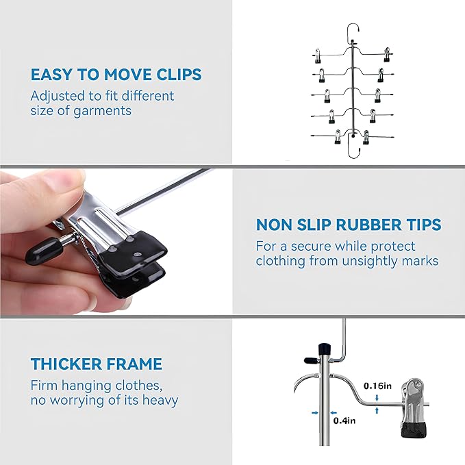 4 Pack Metal Pants Skirt Hangers Organizer,5 Tier Space Saving Hangers with Adjustable Non Slip Clips, Heavy Duty 360 Degree Swivel Hook, Gain 80% More Space for Slacks, Trousers, Shorts, Jeans