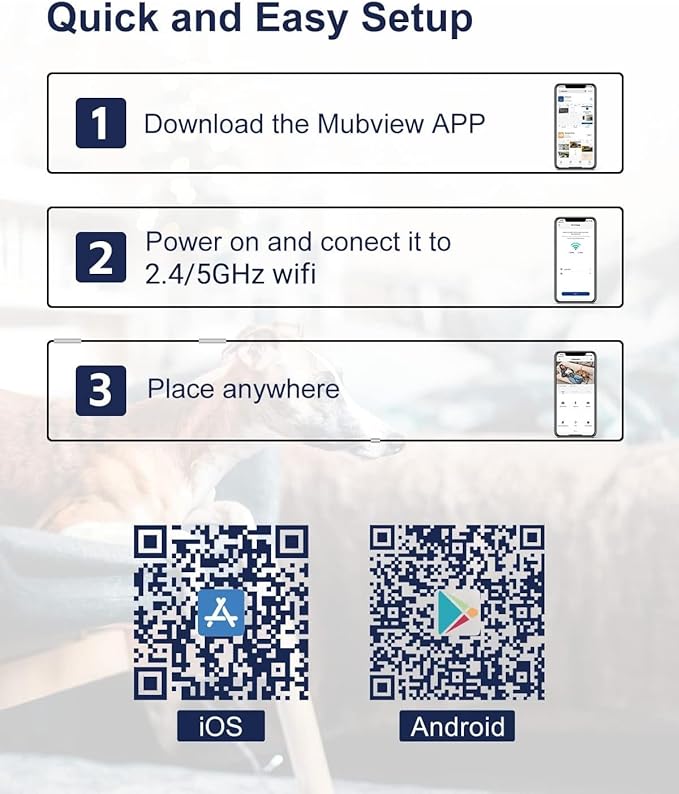 - 【2K Resolution & 360° Coverage】Mubview pet camera with 2K super HD live stream to monitor pets more clearly, turning the head of this dog camera 355° horizontally and 80° vertically through the app seeing the whole picture of your home. The indoor camera works with 2.4/5GHz WiFi