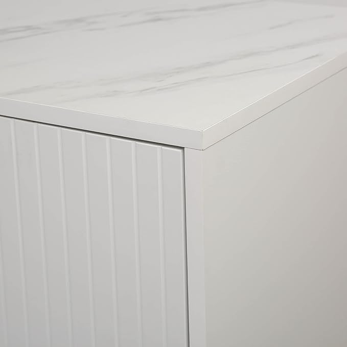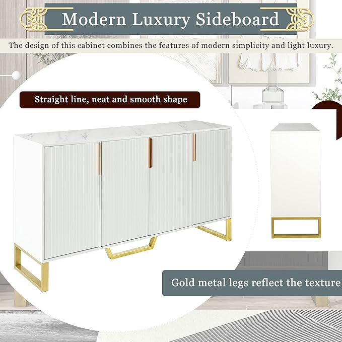 - ❉【Modern Luxury Sideboard】The design of this cabinet combines the features of modern simplicity and light luxury. Straight line, neat and smooth shape, simple lines, no many decorative elements, and pay attention to practicality. Tabletop covered with marble sticker and the pinstripe design on the door panel are elegant and understated, and the gold metal legs reflect the texture, in line with the characteristics of the light luxury style.