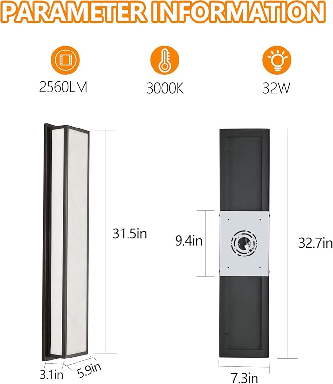 - Outdoor Lights Size: Outdoor wall sconce light body size:(L) 7.3" x (W) 3.9" x (H) x 32.8" inches; back panel size:(L) 7.3" x (H) 9.4" inches, back panel for the United States standard installation.