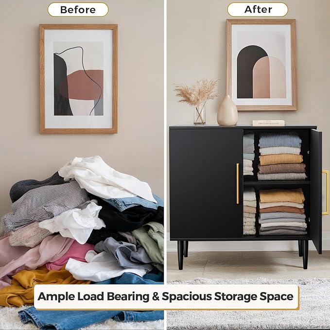 - 【Modern Design】Accent cabinet with gold handle and black legs improve more modern style to your room. Anti dumping device on the back of the sideboard cabinet to ensure the safety of kids or pets. A waterproof desktop will perfectly for you to display your favorite decorations and collectibles.