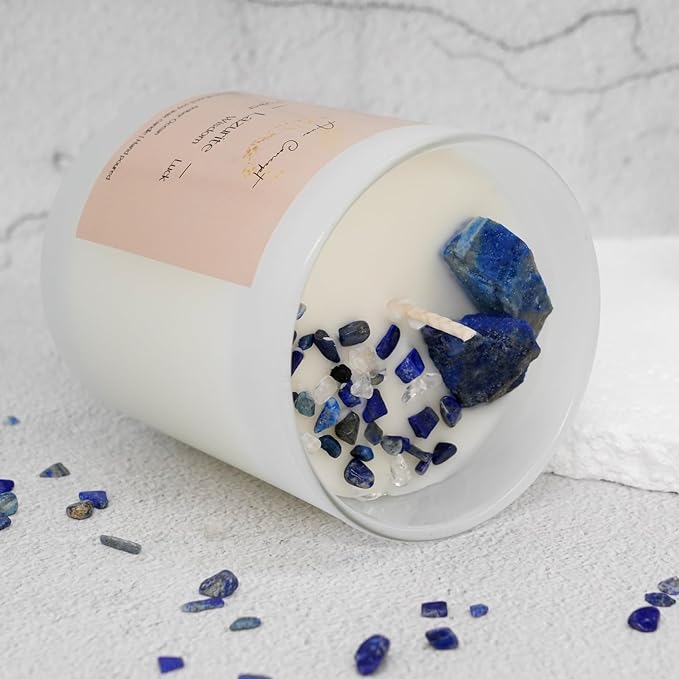 Healing Crystal Candle, Scented Candle Infused Lazurite Clear Quartz Crystals, Amber Ocean Scented, Positivity Energy, Cleansing Wellness, Gift for Women, Aromatherapy Clean Vegan 10Oz Jar