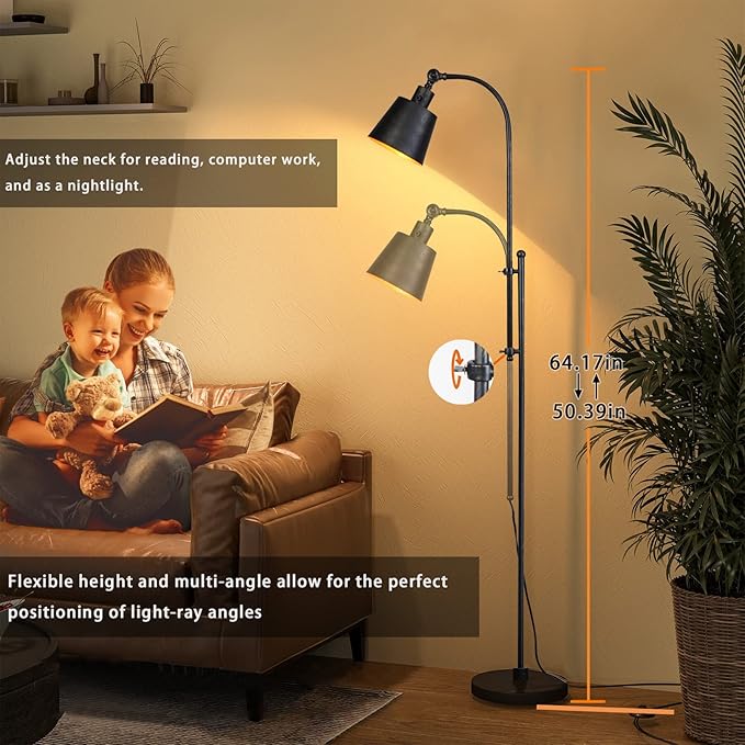 Floor Lamp, Industrial Floor Lamps for Living Rooms & Bedrooms - Rustic Farmhouse Reading Lamp Standing, Adjustable Metal Heads Indoor Task Lighting for Living Room Office Home Décor (Rustic Black)