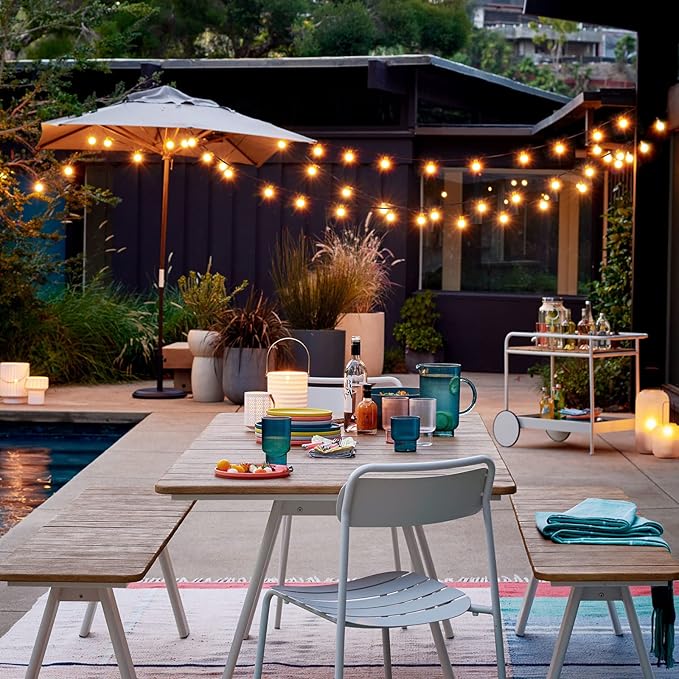 - Linkable Patio String Lights for Large Area: Each 50 FT string has end-to-end design connections, max connect to 19 strings. No need to worry about the length limits. Just simply connect any length you need, our lights will work and brighten your area with a warm glow. Our bulb spacing is 1.97 ft, closer spacing lights up areas better, first bulb to the plug is also 1.97 ft. Light weight, easy to carry and store. You will love these small and cute bulb light strings