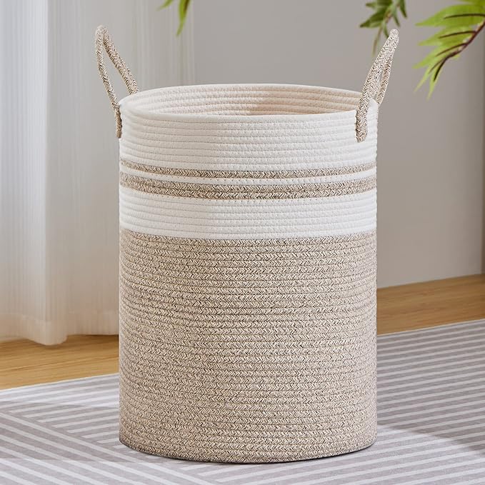VIPOSCO Large Laundry Hamper, Tall Woven Rope Storage Basket for Blanket, Toys, Dirty Clothes in Living Room, Bathroom, Bedroom - 100L Brown & White