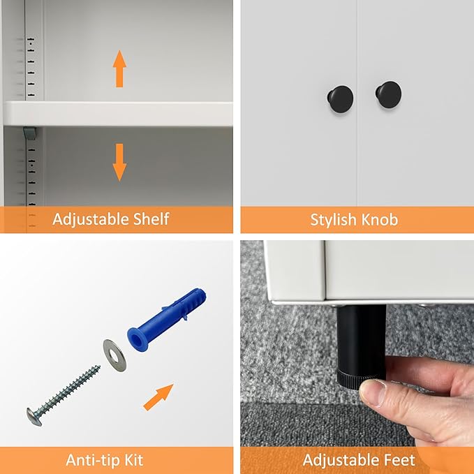 - THOUGHTFUL DESIGN - This metal storage cabinet comes with leg levelers for leveling on uneven ground and keeping the floor from scratching. Moreover, an optional wall anchoring kit is included for anti-tipping purpose
