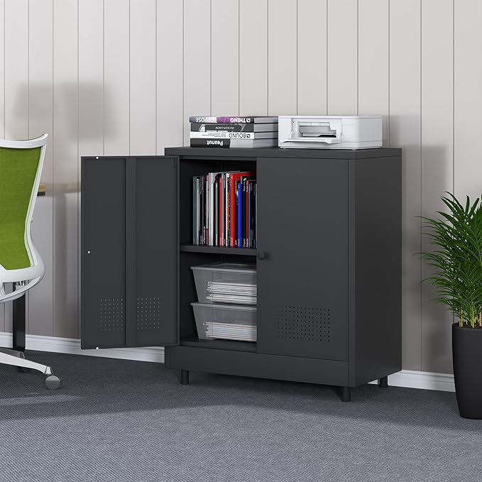 Metal Storage Cabinet with 2 Doors and Adjustable Shelf, Steel Accent Sideboard Buffet Cabinet for Home, Office, Garage, Entryway, Living Room, Kitchen Pantry and Dining Room (Black)