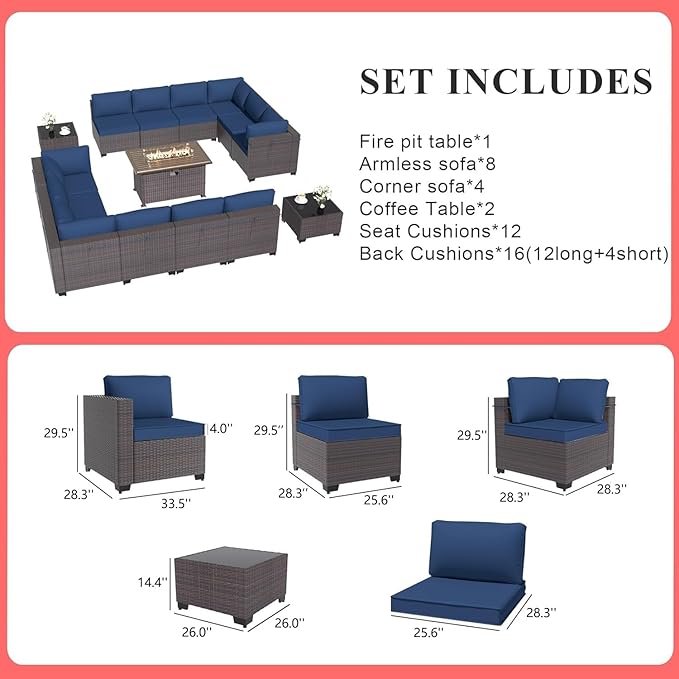 Gotland 15 Pieces Patio Furniture Set with Fire Pit Table, All Weather Rattan Outdoor Furniture with 29.5'' High Backrest 4’’ Thick Cushions Coffee Table, Patio Set for Porch, Deck, Backyard, Navy
