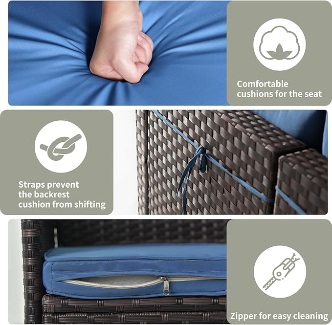 - Durability: This outdoor outdoor patio furniture set is crafted with tightly woven, double-strand all weather PE rattan for high strength and a smooth texture, and supported by a sturdy, rust-resistant frame of galvanized steel. This wicker patio furniture is designed to resist weather elements and harsh weather for durability that stands up to the elements.