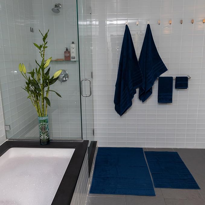 - Towels: 50% Viscose Made From Bamboo & 50% Aegean Turkish Combed Cotton, 700 GSM / Bath Mats: 55% Viscose Made From Bamboo & 45% Aegean Turkish Combed Cotton, 1000 GSM – Carefully crafted with optimal weight and thickness to soak up water and comfort your skin. Double twisted yarns are spun out of extra-long fibers to ensure superior quality and performance. Buy individually or in Family Multi-Packs.
