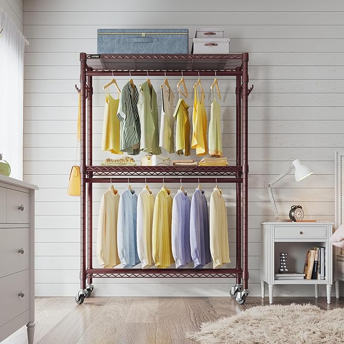 VIPEK R2 Plus Rolling Clothes Rack for Hanging Clothes Heavy Duty Clothing Rack 3 Tiers Adjustable Metal Wire Shelving Garment Racks with Side Hooks, Closet Organizers and Storage Wardrobe, Bronze