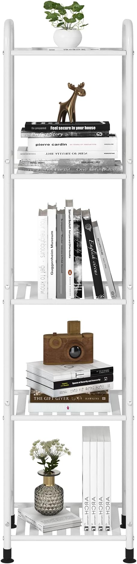 JSB 5 Tier Narrow Bathroom Shelving Unit, Kitchen Storage Rack Organizer Metal Corner Shelf for Living Room Laundry Pantry (Matte White, 5 Tier)