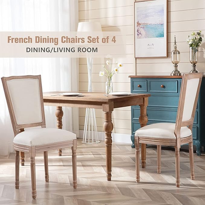 - 🪑Chic French Design: Vintage French dining chairs set of 2, with upholstered dining chairs and finely carved wooden frames, can't stop its elegance and nobility anywhere and provide you with unparalleled comfort. The beauty of bright oak color and linen beige cloth collide with each other, creating a different French charm in your dining environment.