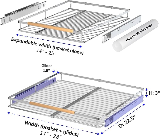 - Expandable Width: This slide out cabinet organizer adds the ability to adjust the width. Upgrade your storage space and enjoy easy access to your items with these practical and functional pull-out shelves