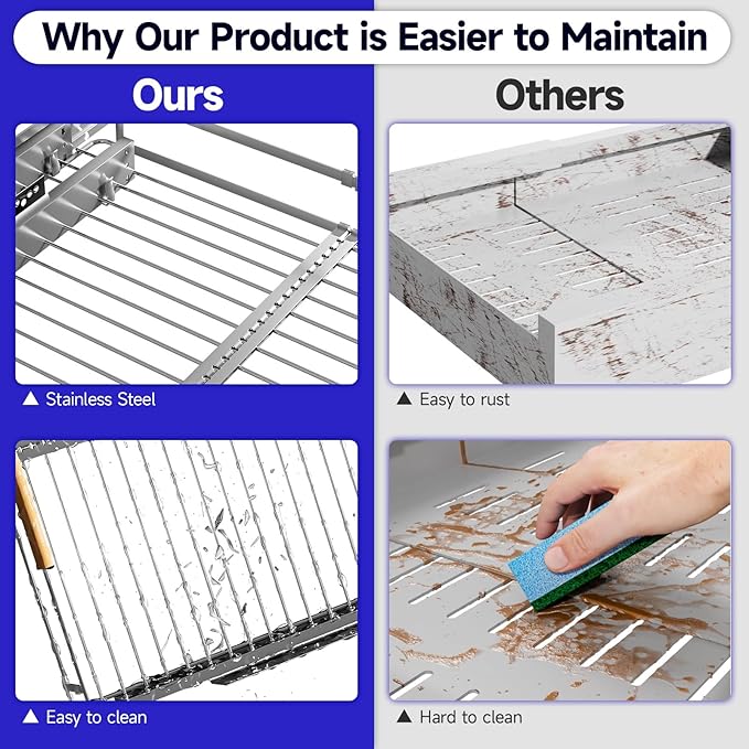 - Sturdy & Heavy-Duty: Our slide out cabinet organizers are made of stainless steel. It features wire construction that is durable enough to handle everything that you put in it