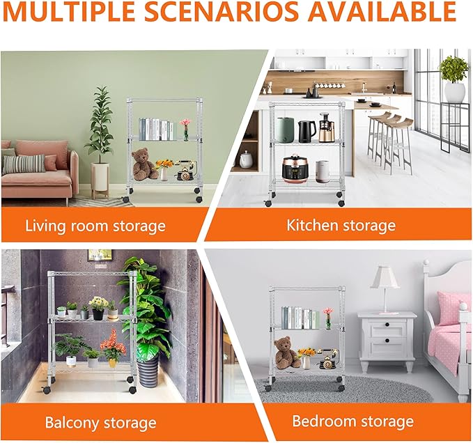 BestOffice | 3-Tier Wire Storage Shelves with Wheels | 23x13x31 | Chrome | Adjustable Racks | Heavy-Duty Metal Shelf, Holds Upto 170 lbs | No-Tool Assembly | Ideal for Home & Garage Shelving