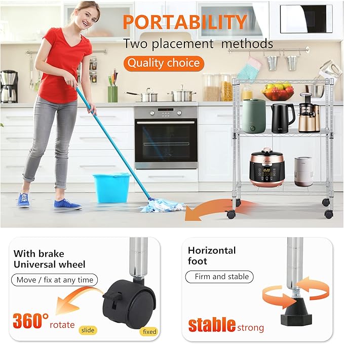 - HEAVY-DUTY & FLEXIBLE SETUP: Use feet levelers for up to 450 lbs total (150 lbs per shelf) or caster wheels for easy mobility, supporting up to 170 lbs when weight is evenly distributed.