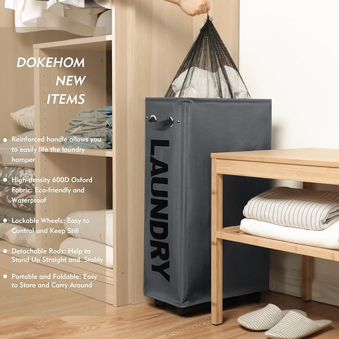 DOKEHOM 29-Inches Enlarged Slim Laundry Basket with Removable Wash Bag on Wheels, Collapsible Rolling Laundry Hamper, Foldable Narrow Corner Clothes Storage Bins (Dark Grey)