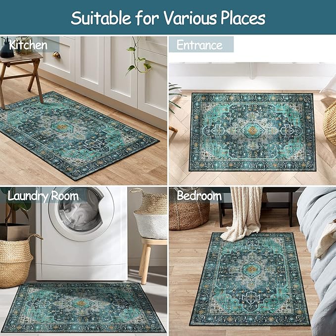 Moynesa Ultra-Thin Washable Area Rug - 2x3 Teal Small Entryway Rug Front Indoor Doormat, Boho Non-Slip Stain Resistance Low Pile Accent Carpet for Kitchen Bathroom Home Laundry Room Hall Decor