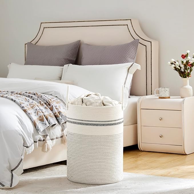 VIPOSCO Large Laundry Hamper, Tall Woven Rope Storage Basket for Blanket, Toys, Dirty Clothes in Living Room, Bathroom, Bedroom - 58L Stripe White