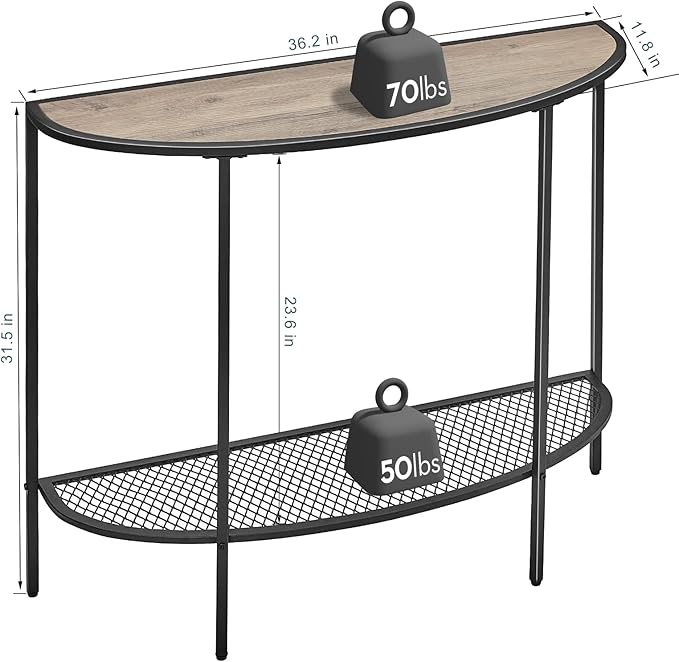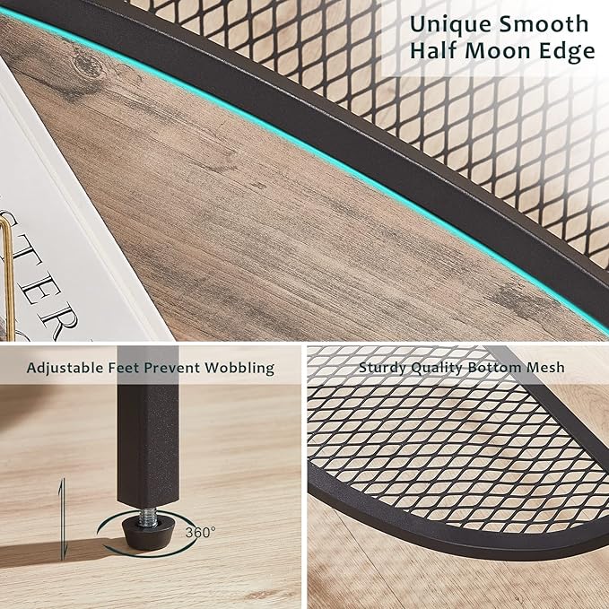 - 【Unique Half Moon Design】Simple and Elegant half moon design matches with your modern home, suitable for small and large spaces. Smooth round edge is much safer than sharp square corners. 2 tier design with farmhouse ‘scratched’ wood top panel and black mesh shelves provides spacious storage space, making your space cleaner and tidier.