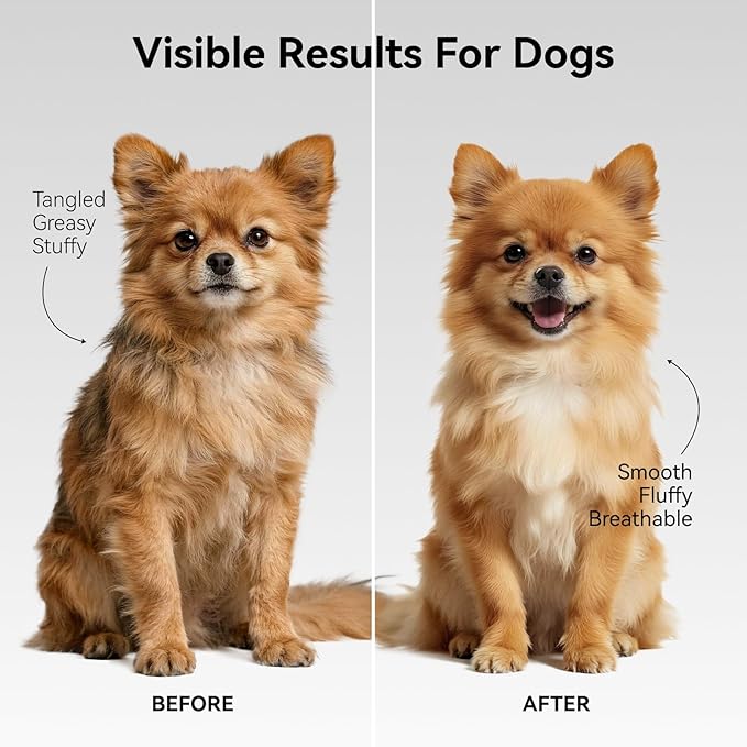- 【PROFESSIONAL · Undercoat Rake】As a deshedding brush for cats & dogs, simply run it through your pet's fur in the direction of growth and apply gentle pressure to easily remove loose hair. As a dematting comb, slowly and gently comb through tangle-prone areas such as ears, chest and legs to painlessly remove mats and tangles. Just 1–2 sessions a week keeps your pet’s coat clean, soft, and tangle-free—no groomer visit required.