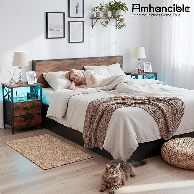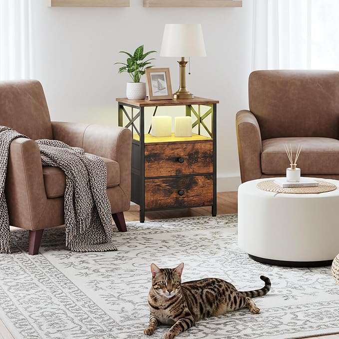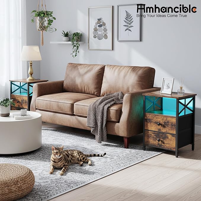 AMHANCIBLE Night Stand Set 2, LED Nightstand with Charging Station, End Tables Living Room with Fabric Drawers, Bedside Table for Bedroom, Rustic Brown, HET052LBR