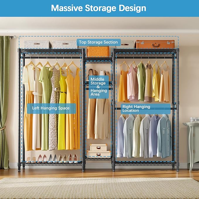 - Multifunction Clothes Rack: Including 7 adjustable shelves and 4 detachable hanging rods for hanging suits, coats, long dresses, jackets, pants, shirts or other heavy clothes. This freestanding closet system ensures you enough space for the essentials. It's a great closet organizer for extra hanging space or seasonal storage