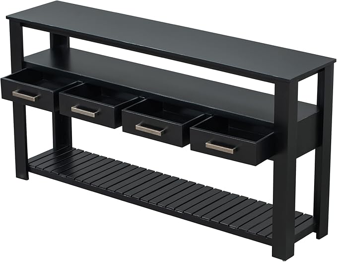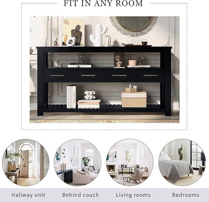 Modern 62'' Console Table Sofa Entryway Table with 4 Drawers and 2 Shelves, Acacia Wood Kitchen Buffet Cabinet Sideboard, Accent Table Furniture for Entryway Kitchen Living Room (Black-4DE)