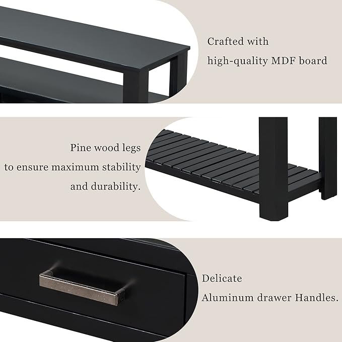 - ♬【Easy Assembly】Our beautiful console table adds a touch of elegance to your home! Crafted with high quality MDF and Solid Pine is a perfect complement to your room. It can also be used as a console table or sideboard. Our console table shipped with easy-to-follow and detailed instructions, all of the hardware and pieces were labeled perfectly and easy to assemble.