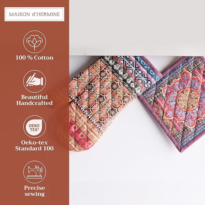 Maison d' Hermine 100% Cotton Oven Mitt & Pot Holder Set (7.5"x13" & 8"x8") Heat Resistant BBQ Cooking Gloves with Loop for Thanksgiving Christmas Decorations Handling Hot Pans (Ispahan)