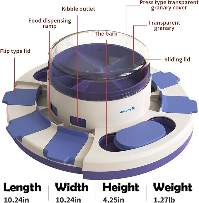 - đŸăEasy to UseăDog puzzle toys have 6 flip type lids, you can add food to the granary, pets press down on the transparent lid, food will fall into the leaky food-box. Pets also can eat food by moving 2 sliding lids.
