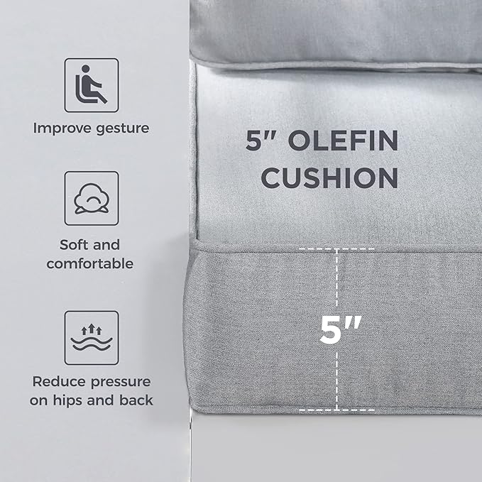 - 【5-INCH OLEFIN CUSHION】Covering the top of the outdoor furniture baseplate, the piped cushions provide 5-inch padding as you sit. Thickened at the waist, the foam-filled cushions encourage proper posture while you sit. Each cushion of the outdoor patio set is wrapped in Olefin fabric, so it's sure to stand up to UV rays beaming down when left outdoors.