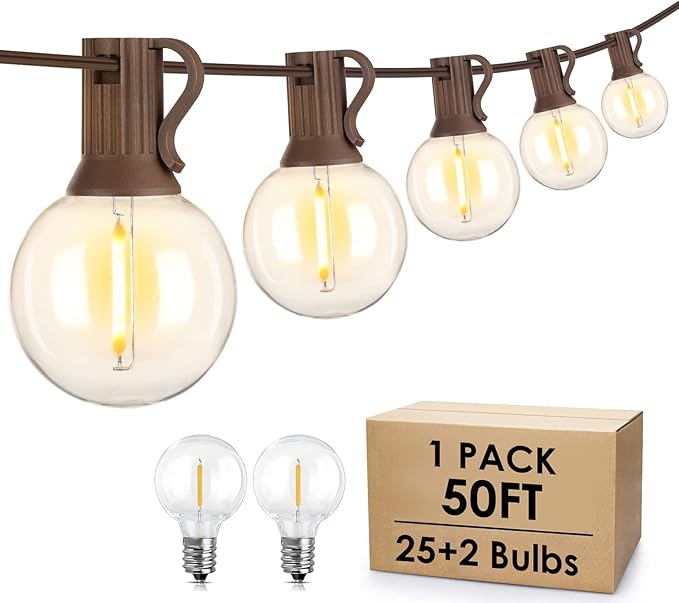 - Brown Cord Dimmable Outdoor Patio Lights: Our 50 ft brown wire string lights with 25 sockets, 27 plastic bulbs (2 spare), brown wire has more vintage and old-fashioned ambient lighting atmosphere. 2700K warm light echoes with it, which can add some warmth to your patio, garden, private space. Compatible with dimmers (not included in the package), you can customize or change the atmosphere you want by changing the brightness. Perfect for your garden, deck, porch, pergola, balcony decoration