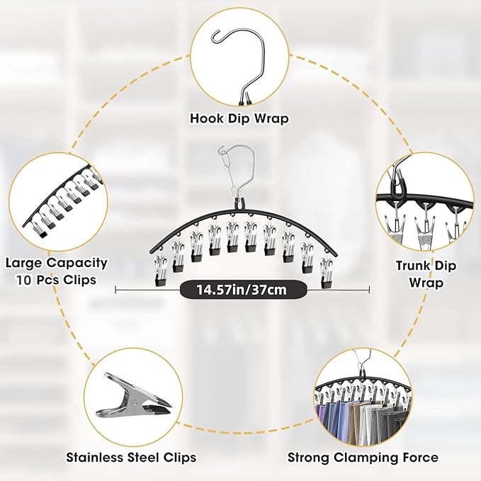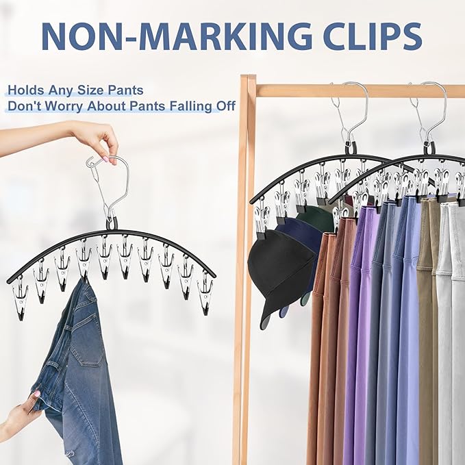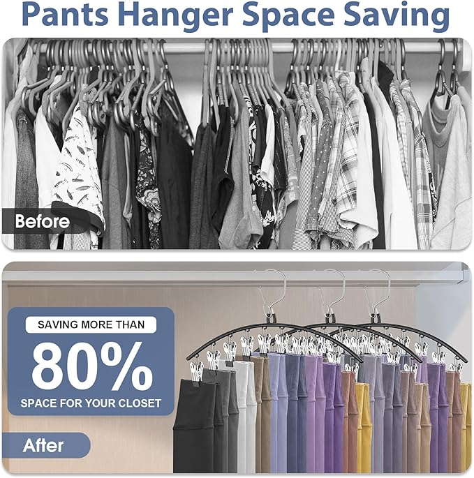 - Space Saving Hangers: The yoga pant hangers with clips can conveniently store a lot of pants; The skirt hangers for women effectively utilizes the vertical space in the wardrobe, allowing you to store more items in a compact space; The clips are very strong and can hold much weight if you choose to hang clothes or toys from them; This hooks for hanging clothes are easy ways to hang leggings in the closet that saves space and also makes all pairs visible and easy to pick