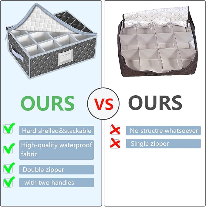 - đ„ăSturdy Handles & Zippersă: The china storage containers with 2 sturdy handles on the sides for easy carrying and moving. Additionally, two #5 stainless steel zippers are designed to better protect the cups inside the box and make it easy to store and retrieve cups.