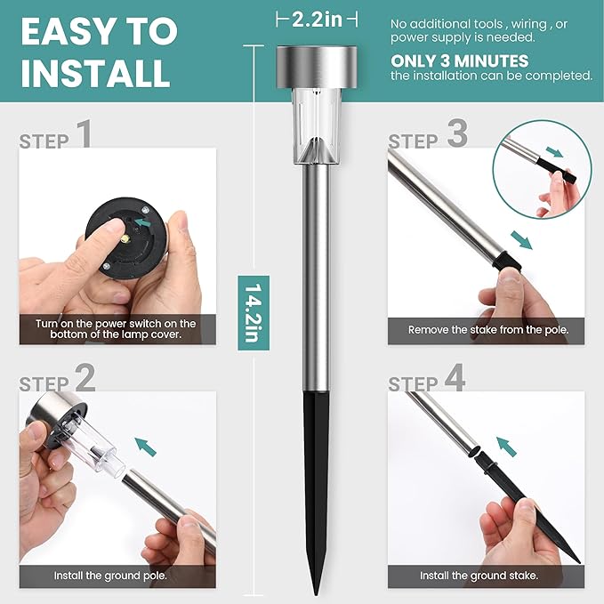 - 【WATERPROOF】 Solar garden lights are made of stainless steel. They are durable and no worry about bad weather.IP 44 can ensure the solar driveway lights work in any weather.