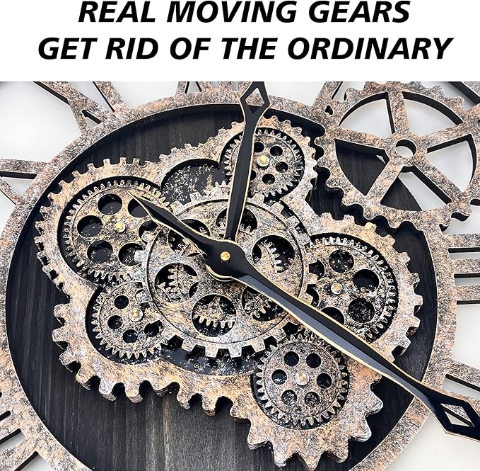 - REAL MOVING GEARS: Large wall clock with unique moving parts is as attractive as it is functional. Put batteries in, various gears start rotating fluently. Moving gear wall clock is amazing looking on the wall and will get so many compliments on it. Made from solid wood and painted by Rust-like color on wall clock create a very rustic and industrial atmosphere. Large farmhouse wall clock is professionally handmade and pursuit of naturalness, so it may have some little imperfections.