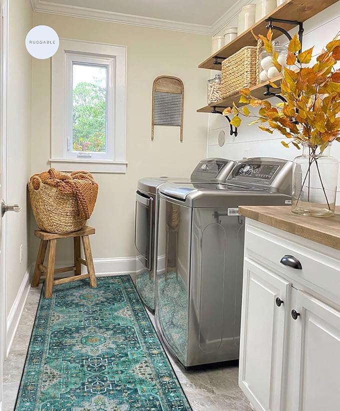 Moynesa Ultra-Thin Washable Runner Rug - 2x7 Teal Hallway Rug Runner Kitchen Carpet Runner, Non Skid Non Shedding Low Pile Bathroom Mat for Apartment Entryway Foyer Vanity RV