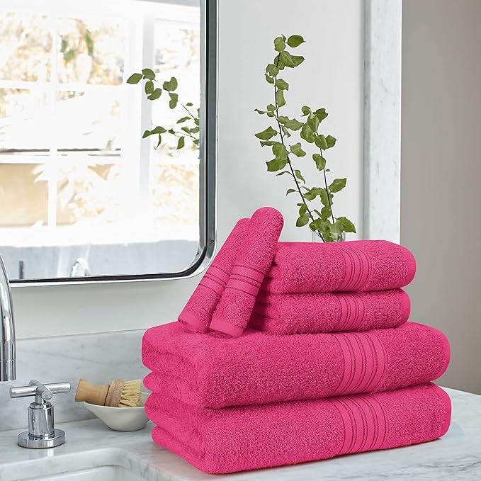 BOUTIQUO 6 Pack Cotton Towel Set, Contains 2 Bath Towels 28x55 inch, 2 Hand Towels 16x24 inch & 2 Wash Coths 12x12 inch, Ideal Everyday use, Ultra Soft Compact & Lightweight - Hot Pink