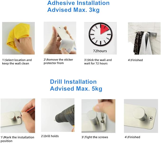 - 【Easy to Install】No damage to your wall with 3M adhesive on smooth non-porous surfaces, so that the towel rack can be easily removed. Screw-in hooks applies to more firm and heavy uses, all accessories are included.