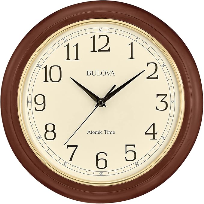 Bulova Atomic Time 2 Analog Wall Clock C5004 | 12.4" Wooden Frame, Sets Time Automatically | Quartz Movement | Battery Operated | Classic Design